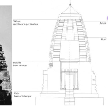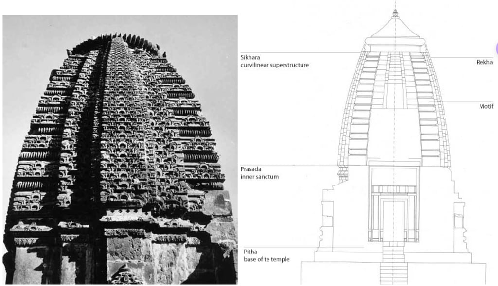चित्र 1. हिंदू मंदिराची मूलभूत औपचारिक योजना. भारतातील महा-गुर्जर मंदिर बांधणी शाळेतील एक दगडी लाटिना मंदिर (960 इ.स.) चे उदाहरण. वरची रचना निर्माणाच्या स्थिरोटॉमिक तत्त्वांवर आणि पृष्ठभागाच्या अभिव्यक्तीवर आधारित जियोमेट्रिक आणि गणितीय अभिव्यक्तीच्या जटिल परस्परसंवादाचे प्रदर्शन करते.