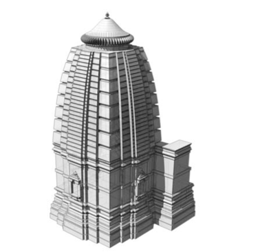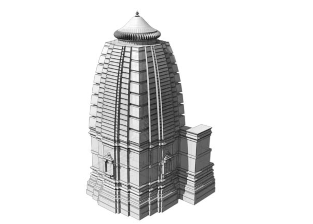 चित्र 2. राणकदेवी मंदिर, वढवाण याचे त्रिमितीय पुनर्निर्माण. या मंदिराच्या वरच्या रचनेची भूमिती व्यक्तिगत घटकांच्या प्रमाण आणि वक्रता निश्चित करण्यासाठी भूमितीय प्रगतीचा वापर करून मॉडेल केली आहे.